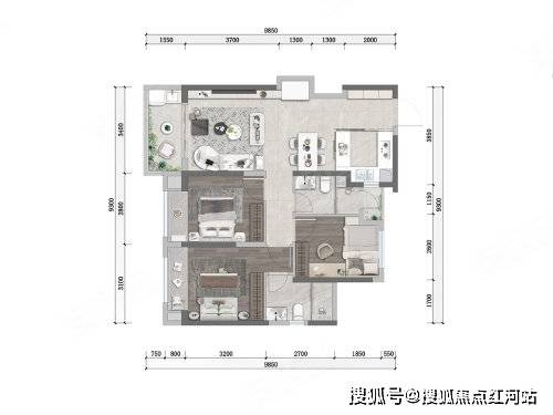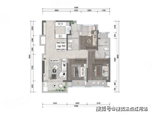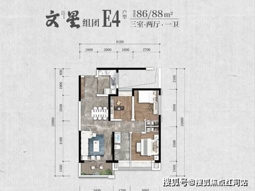 焦点亮点:全明款式,适合二胎家庭昆明书喷鼻云海由央企招商蛇口取国企华发股份结合开辟,88㎡ E3户型(3室2厅1卫):玄关入户,